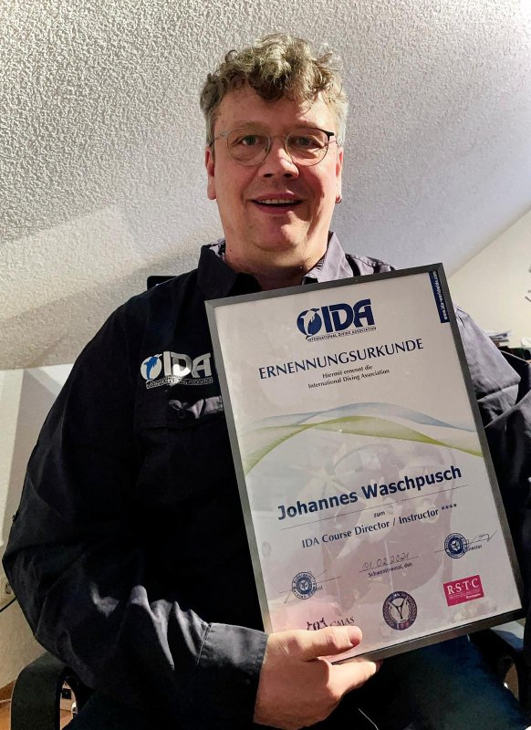 Johannes Waschpusch, owner of the diving school Seelbach, IDA license number 007 (does not include a license to kill) and instructor 3 star, is a veteran of IDA regardless of his young age. Because he has been with us since the day IDA was founded in 1996. As a thank for his many years of loyalty, active participation in the association and the training of many diving instructors and those who want to become one, the Presidium of IDA appoints Johannes as IDA TL 4 / Course Director with immediate effect. Surprised but shaved. :-)